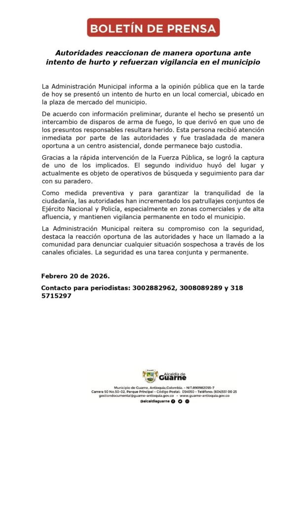 Por su parte la Administración Municipal mediante comunicado a la opinión pública informó que “en la tarde de hoy se presentó un intento de hurto en un local comercial, ubicado en la plaza de mercado del municipio. De acuerdo con información preliminar, durante el hecho se presentó un intercambio de disparos de arma de fuego, lo que derivó en que uno de los presuntos responsables resultara herido. Esta persona recibió atención inmediata por parte de las autoridades y fue trasladada de manera oportuna a un centro asistencial, donde permanece bajo custodia.