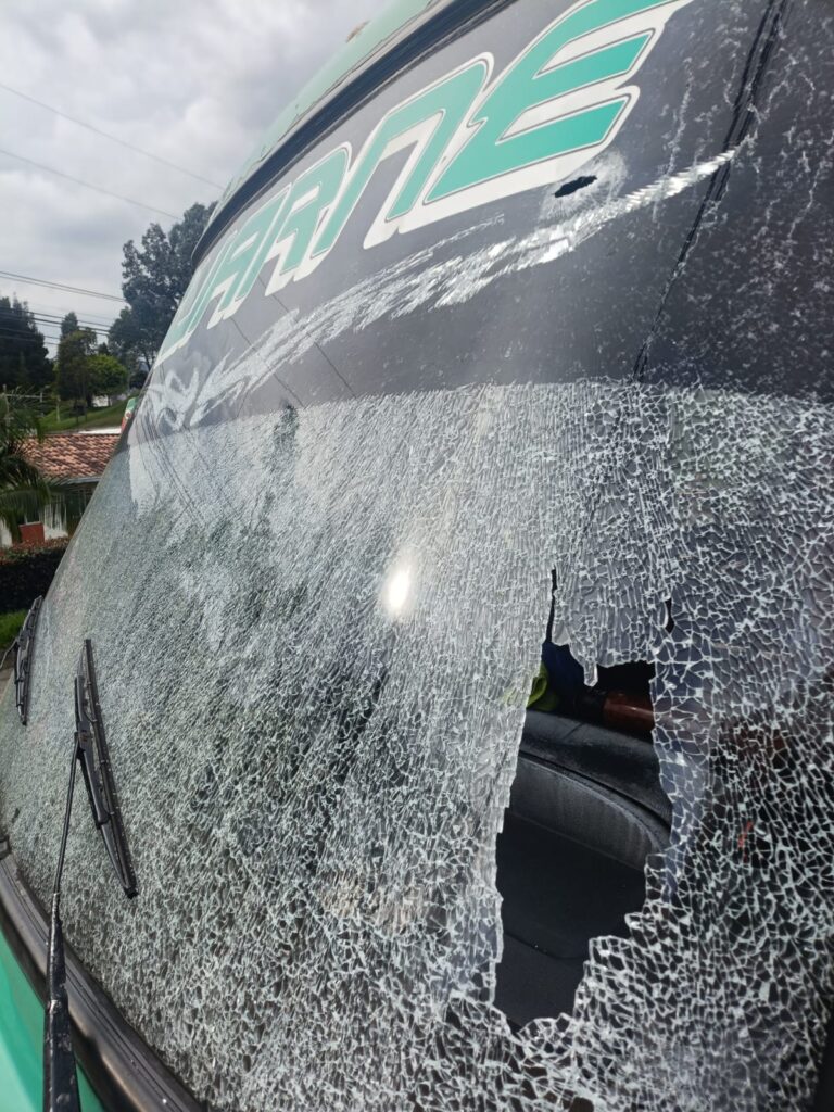Una buseta de la empresa Coopeguarne que pasaba por el sitio recibió uno de los disparos que al parecer se registró en un intercambio entre personas que habían en el interior del bar y los presuntos atracadores.